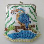 2016Gebreide kralentas met een forel, de tas is gevoerd van binnen en echt te gebruiken, de beugel heeft een ketting maar die is voor de foto naar achteren gestopt.